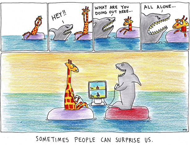 September 15, 2014 – People can surprise us September 15, 2014 Penny Redshaw daily giraffesart, cartoon, comic, drawing, funny, illustration Share this: Click to share on Facebook (Opens in new window) Facebook Click to share on X (Opens in new window) X Click to share on Tumblr (Opens in new window) Tumblr Click to share on Pinterest (Opens in new window) Pinterest Click to email a link to a friend (Opens in new window) Email Like Loading... Related