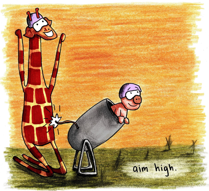 March 10, 2016 – Aim high March 10, 2016 Penny Redshaw daily giraffesart, cartoon, drawing, dreams, goals, illustration, inspiration, life, motivation (p.s. do not try this at home, piggies belong in fields not cannons) Share this: Click to share on Facebook (Opens in new window) Facebook Click to share on X (Opens in new window) X Click to share on Tumblr (Opens in new window) Tumblr Click to share on Pinterest (Opens in new window) Pinterest Click to email a link to a friend (Opens in new window) Email Like Loading... Related