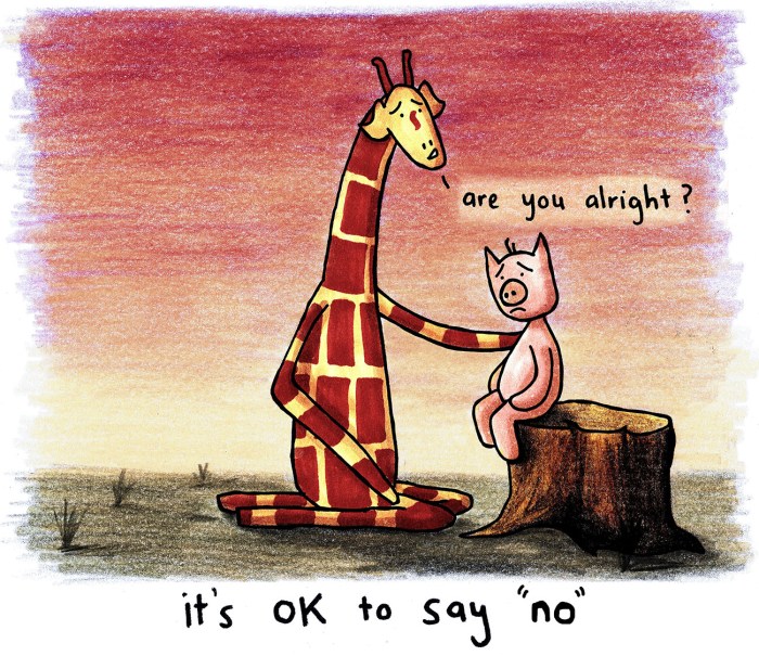 August 31, 2016 – It’s OK to say Image August 31, 2016 Penny Redshaw daily giraffesart, cartoon, depression, drawing, friendship, illustration, inspiration, mental health, motivation Share this: Click to share on Facebook (Opens in new window) Facebook Click to share on X (Opens in new window) X Click to share on Tumblr (Opens in new window) Tumblr Click to share on Pinterest (Opens in new window) Pinterest Click to email a link to a friend (Opens in new window) Email Like Loading... Related