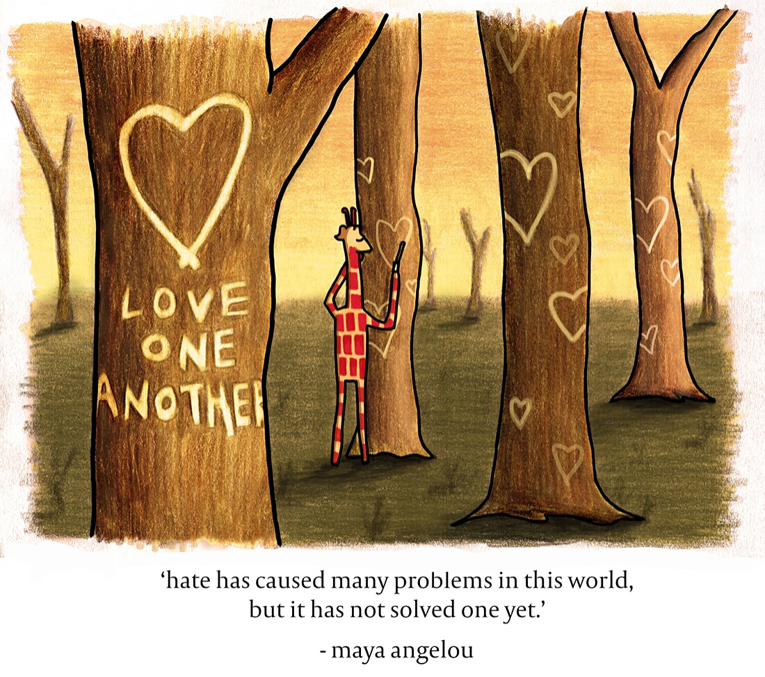 November 29, 2016 – Hate and Love November 29, 2016January 16, 2017 Penny Redshaw daily giraffesart, cartoon, drawing, hope, illustration, inspiration, love, motivation, quotes Hate has caused many problems in this world, but it has not solved one yet. – Maya Angelou Share this: Click to share on Facebook (Opens in new window) Facebook Click to share on X (Opens in new window) X Click to share on Tumblr (Opens in new window) Tumblr Click to share on Pinterest (Opens in new window) Pinterest Click to email a link to a friend (Opens in new window) Email Like Loading... Related